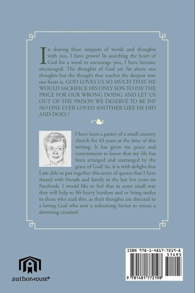 In sharing these snippets of words and thoughts with you, I have grown! In searching the heart of God for a word to encourage you, I have become encouraged. The thoughts of God are far above our thoughts but the thought that reaches the deepest into our heart is, GOD LOVES US SO MUCH THAT HE WOULD SACRIFICE HIS ONLY SON TO PAY THE PRICE FOR OUR WRONG DOING AND LET US OUT OF THE PRISON WE DESERVE TO BE IN!! NO ONE EVER LOVED ANOTHER LIKE HE DID AND DOES!