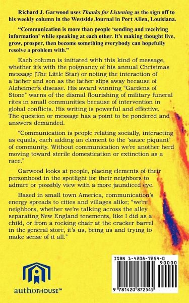 Thanks for listening is the sign-off R. James Garwood uses in his weekly column in the Westside Journal in Port Allen Louisiana. It's a compilation of notes "Sarge" has taken concerning politics and the majesty of human nature in small town America. "Communication is more than people 'sending and receiving information' while speaking at each other. It's making thought live, grow, prosper, then become something everybody can hopefully resolve a problem with." Garwood initiates each column with this kind of message, whether it's with the poignancy of his annual Christmas message (The Little Star) or noting the interaction of a father and son as the father slips away because of Alzheimer's disease. His award winning "Gardens of Stone" warns of the dismal flourishing of military funeral rites in small communities because of intervention in global conflicts. His writing is powerful and effective. The question or message has a point to be pondered and answers demanded. "Communication is people relating socially, interacting as equals, each adding an element to the 'sauce piquant' of community. Without communication we're another herd moving toward sterile domestication or extinction as a race." Garwood looks at people, placing elements of their personhood in the spotlight for their neighbors to admire or possibly view with a more jaundiced eye. Finally, Garwood paints a portrait of the landscape of America. Based in small town America, communication's energy spreads to cities and villages alike; "we're neighbors, whether we're talking across the alley separating New England tenements, like I did as a child, or from a rocking chair at the Cracker Barrel in the general store, it's us, being us and trying to make sense of it all." Things are finally looking up.