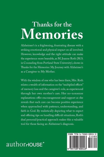 Alzheimer's is a frightening, frustrating disease with a striking emotional and physical impact on all involved. However, knowledge and the right attitude can make the experience more bearable, as M. Joanne Roth (M.S. in Counseling from Portland State University), shows in Thanks for the Memories: My Journey with Alzheimer's as a Caregiver to My Mother. With the wisdom of one who has been there, Mrs. Roth relates a wealth of information on the "multiplied effects" of memory loss and the caregiver's role, as experienced through her own mother's care. Her no-nonsense explanations offer encouragement and support as she reveals that such care can become positive experience when approached with patience, understanding, and faith in God. By realistically depicting what to expect and offering tips on handling difficult situations, Roth's dual personal/practical approach makes this a valuable tool for those facing an Alzheimer's diagnosis.