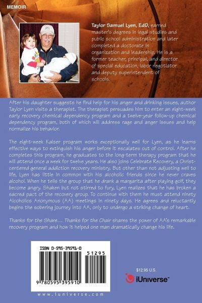 After his daughter suggests he find help for his anger and drinking issues, author Taylor Lyen visits a therapist. The therapist persuades him to enter an eight-week early recovery chemical dependency program and a twelve-year follow-up chemical dependency program, both of which will address rage and anger issues and help normalize his behavior. The eight-week Kaiser program works exceptionally well for Lyen, as he learns effective ways to extinguish his anger before it escalates out of control. After he completes this program, he graduates to the long-term therapy program that he will attend once a week for twelve years. He also joins Celebrate Recovery, a Christ-centered general addiction recovery ministry. But other than not adjusting well to life, Lyen has little in common with his alcoholic friends since he never craves alcohol. When he tells the group that he drank a margarita after playing golf, they become angry. Shaken but not stirred to fury, Lyen realizes that he has broken a sacred pact of the recovery group. To continue with them he must attend ninety Alcoholics Anonymous (AA) meetings in ninety days. He agrees and reluctantly begins the sobering journey into AA, only to undergo a striking change of heart. Thanks for the Share. Thanks for the Chair shares the power of AA's remarkable recovery program and how it helped one man dramatically change his life.
