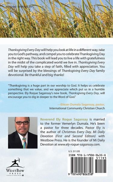 Thanksgiving Every Day will help you look at life in a different way, take you to God's pathway, and compel you to celebrate Thanksgiving Day in the right way. This book will lead you to live a life with gratefulness in the midst of the complicated world we live in. Thanksgiving Every Day will help you take a step of faith, filled with appreciation. You will be surprised by the blessings of Thanksgiving Every Day family devotional. Be thankful and big thanks! "Thanksgiving is a huge part in our worship to God. It helps us celebrate something that we value, and we appreciate which put us in a humble perspective. Ely Roque Sagansay's new book, Thanksgiving Every Day, will encourage you to dig in deeper to the Word of God." -Eliezer Dumala Sagansay, pastor, International Community Christian Church