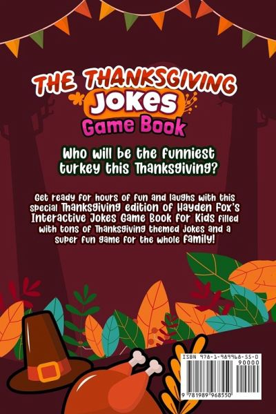 A Super Fun And Unique Thanksgiving Gift or Family Activity Idea For Kids! The Ultimate Thanksgiving Themed Interactive Edition Jokes Game Book For Kids Is Here To Make Hours Fly Like Minutes! Fill up your plates, grab your pumpkin pie and get ready for the most hilarious LOL Thanksgiving jokes for kids with a TWIST! Introducing The Kid-Favorite You Laugh You Lose Game Book For Kids - Thanksgiving Edition By Hayden Fox! Now you can break the ice and turn any socially awkward situation into a laughter-packed joke-a-palooza with the try not to laugh challenge joke book for kids OR have the best Thanksgiving family game night ever! Here's A Sneak Peek: Who is a turkey's favorite kind of person on Thanksgiving? A vegetarian! But Wait... There's More! Unlike other children's joke books, riddle books for children, and game books for kids, this Thanksgiving joke/game book will make this Thanksgiving more entertaining than ever! Here's What You Get In This Super Fun Special Edition Thanksgiving Joke Book For Boys & Girls: ¿Tons of hilarious, clean, and age-appropriate jokes for kids, children, and parents ¿Dreadfully funny Thanksgiving jokes and knock knocks ¿Fun-packed puns and thought-provoking riddles for kids And The Best Part? This year's Thanksgiving game night will be twice as fun! And That's A Guarantee! Top 3 Reasons This Joke Book Game For Children Is A Thanksgiving Essential: ¿¿ You don't have to deal with bored kids who just want to play with their tablets or smartphones. ¿¿ You can spark some friendly competition by turning it into a contest ¿¿ You can make everyone happy and create long-lasting memories! Looking For A Great Thanksgiving Game Book For Kids That The Whole Family Will Enjoy? Scroll Up, Click "Buy Now" & Make This Thanksgiving The Best One Yet!