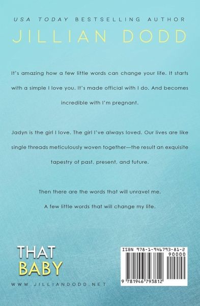 First comes love, then comes marriage . . . and then comes That Baby, the third book in the That Boy series by USA Today bestselling author, Jillian Dodd. It’s amazing how a few little words can change your life. It starts with a simple I love you. It’s made official with I do. And becomes incredible with I’m pregnant. Jadyn is the girl I love. The girl I’ve always loved. Our lives are like single threads meticulously woven together—the result an exquisite tapestry of past, present, and future. Then there are the words that will unravel me. A few little words that will change my life.