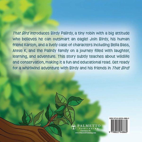 Join Birdy, the cheeky robin with a big attitude, on his hilarious adventures! Meet Karsyn, Bella Bass, and the Palirdy family. Learn about wildlife and conservation through laughter and fun! In That Bird, you'll be swept away on a whirlwind journey with Birdy Palirdy, a small robin with a giant personality. Birdy is no ordinary bird; he's convinced he can take on an eagle and win! His confidence and snappy wit make every page a delight to read. Birdy's adventures take him far and wide, where he meets a colorful cast of characters. There's Karsyn, his human companion, who shares Birdy's love for the great outdoors. Bella Bass, a baby bass with a passion for pro fishing, adds a splash of excitement to the story. But it's not all fun and games. Birdy's journey is also a lesson in the importance of caring for our environment. His adventures subtly teach readers about conservation and wildlife, making That Bird not just an entertaining read, but an educational one too. The Palirdy family, including Birdy's sister Amelie, a professional singer, and his cousin Marilee, add to the fun. They're a quirky bunch, each with their unique traits and talents. And let's not forget Annie K, the bear nanny who often butts heads with Birdy, adding a dash of drama and humor to the mix. That Bird is more than just a story. It's a journey filled with laughter, learning, and a whole lot of heart. It's about friendship, family, and the importance of respecting nature. It's about a small bird with a big dream, and the unforgettable adventures he embarks on. So, are you ready to join Birdy and his friends on their incredible adventure? Dive into That Bird and discover a world of humor, heart, and a whole lot of fun!