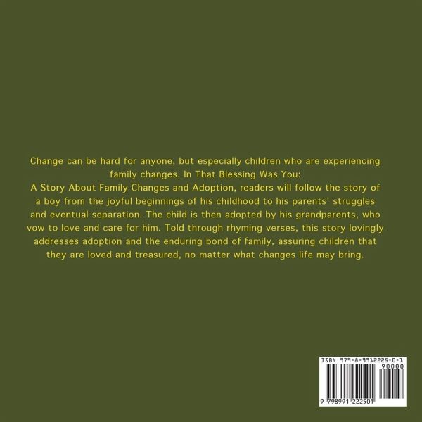 Change can be hard for anyone, but especially children who are experiencing family changes. In That Blessing Was You: A Story About Family Changes and Adoption, readers will follow the story of a boy from the joyful beginnings of his childhood to his parents' struggles and eventual separation. The child is then adopted by his grandparents, who vow to love and care for him. Told through rhyming verses, this story lovingly addresses adoption and the enduring bond of family, assuring children that they are loved and treasured, no matter what changes life may bring.