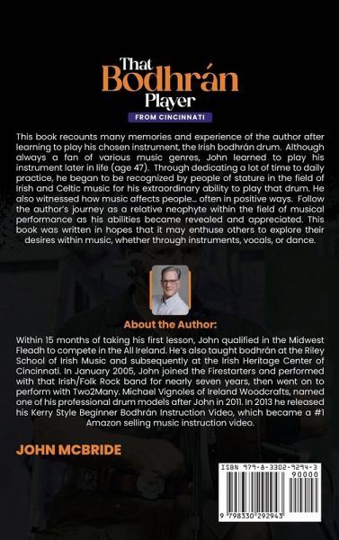 This book recounts many memories and experiences of the author after learning to play his chosen instrument, the Irish bodhrán drum. Although always a fan of various music genres, John learned to play an instrument later in life (age 47). Through dedicating a lot of time to daily practice, he began to be recognized by people of stature in the field of Irish and Celtic music for his extraordinary ability to play that drum. He also witnessed how music affects people, often in positive ways. Follow the author's journey as a relative neophyte within the field of musical performance as his abilities became revealed and appreciated. This book was written in hopes that it may enthuse others to explore their desires within music, whether through instruments, vocals, or dance.
