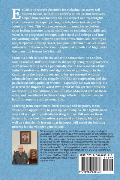 Exiled to corporate obscurity for violating too many Bell System taboos, author Bill Groce's initiative and creativity helped him earn his way back to respect and meaningful contribution in the rapidly changing telephone industry of the 1960s and '70s. This work experience mirrored his evolution from feeling insecure in early childhood to realizing his skills and value as he progressed through high school and college and into the working world. In sharing stories of his childhood, coming of age, telephone industry career, and post-retirement activities and initiatives, Bill also reflects on his spiritual growth and highlights the many life lessons he's learned. From his birth in 1936 in the Asheville Sanatorium, in Candler, North Carolina, Bill's childhood is shaped by being "the preacher's son" whose family moves periodically due to the demands of his father's profession. Bill's nostalgic views of growing up in the Carolinas in the 1940s, 1950s and 1960s are leavened with his acknowledgement of the tragedy of Old South segregation and the patriarchal subjugation of women-especially his own mother. He observed the impact of World War II and its unexpected influence on facilitating the cultural revolution that addressed both of those evils and contributed to these change efforts in his own way in both his corporate and personal life. Learning from experiences, both positive and negative, is too valuable an opportunity to pass up, yet many do. In a lighthearted way and with gently self-deprecating humor, Bill weaves these threads into a book that offers a personal and family history as well as valuable life lessons that he hopes will speed the learning process for the younger generations.