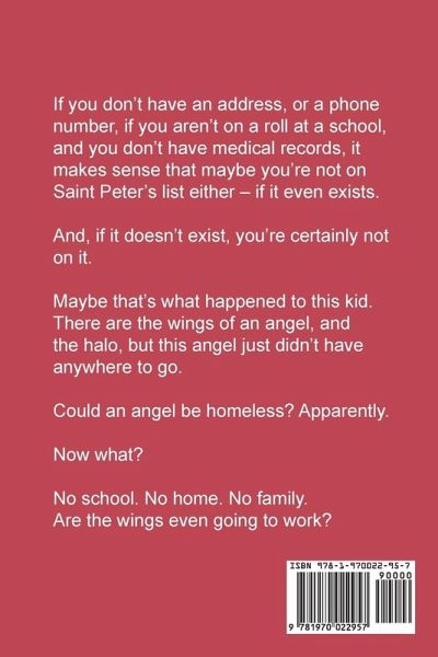 If you don't have an address, or a phone number, if you aren't on a roll at a school, and you don't have medical records, it makes sense that maybe you're not on Saint Peter's list either -- if it even exists. And, if it doesn't exist, you're certainly not on it. Maybe that's what happened to this kid. There are the wings of an angel, and the halo, but this angel just didn't have anywhere to go. Could an angel be homeless? Apparently. Now what? No school. No home. No family. Are the wings even going to work?