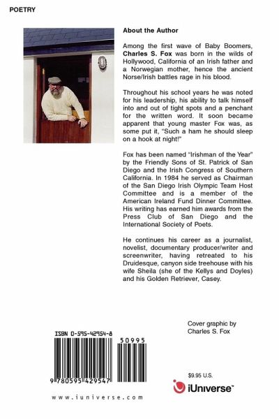 Among the first wave of Baby Boomers, Charles S. Fox was born in the wilds of Hollywood, California of an Irish father and a Norwegian mother, hence the ancient Norse/Irish battles rage in his blood. Throughout his school years he was noted for his leadership, his ability to talk himself into and out of tight spots and a penchant for the written word. It soon became apparent that young master Fox was, as some put it, "Such a ham he should sleep on a hook at night!" Fox has been named "Irishman of the Year" by the Friendly Sons of St. Patrick of San Diego and the Irish Congress of Southern California. In 1984 he served as Chairman of the San Diego Irish Olympic Team Host Committee and is a member of the American Ireland Fund Dinner Committee. His writing has earned him awards from the Press Club of San Diego and the International Society of Poets. He continues his career as a journalist, novelist, documentary producer/writer and screenwriter, having retreated to his Druidesque, canyon side treehouse with his wife Sheila (she of the Kellys and Doyles) and his Golden Retriever, Casey.