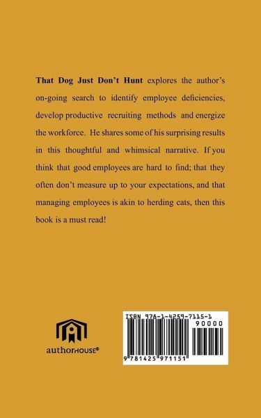 That Dog Just Don't Hunt explores the author's on-going search to identify employee deficiencies, develop productive recruiting methods and energize the workforce. He shares some of his surprising results in this thoughtful and whimsical narrative. If you think that good employees are hard to find; that they often don't measure up to your expectations, and that managing employees is akin to herding cats, then this book is a must read!
