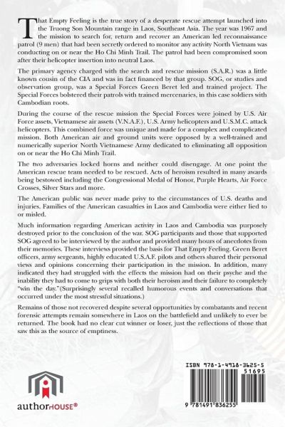 That Empty Feeling is the true story of a desperate rescue attempt launched into the Truong Son Mountain range in Laos, Southeast Asia. The year was 1967 and the mission to search for, return and recover an American led reconnaissance patrol (9 men) that had been secretly ordered to monitor any activity North Vietnam was conducting on or near the Ho Chi Minh Trail. The patrol had been compromised soon after their helicopter insertion into neutral Laos. The primary agency charged with the search and rescue mission (S.A.R.) was a little known cousin of the CIA and was in fact financed by that group. SOG, or studies and observation group, was a Special Forces Green Beret led and trained project. The Special Forces bolstered their patrols with trained mercenaries, in this case soldiers with Cambodian roots. During the course of the rescue mission the Special Forces were joined by U.S. Air Force assets, Vietnamese air assets (V.N.A.F.), U.S. Army helicopters and U.S.M.C. attack helicopters. This combined force was unique and made for a complex and complicated mission. Both American air and ground units were opposed by a well-trained and numerically superior North Vietnamese Army dedicated to eliminating all opposition on or near the Ho Chi Minh Trail. The two adversaries locked horns and neither could disengage. At one point the American rescue team needed to be rescued. Acts of heroism resulted in many awards being bestowed including the Congressional Medal of Honor, Purple Hearts, Air Force Crosses, Silver Stars and more. The American public was never made privy to the circumstances of U.S. deaths and injuries. Families of the American casualties in Laos and Cambodia were either lied to or misled. Much information regarding American activity in Laos and Cambodia was purposely destroyed prior to the conclusion of the war. SOG participants and those that supported SOG agreed to be interviewed by the author and provided many hours of anecdotes from their memories. These interviews provided the basis for That Empty Feeling. Green Beret officers, army sergeants, highly educated U.S.A.F. pilots and others shared their personal views and opinions concerning their participation in the mission. In addition, many indicated they had struggled with the effects the mission had on their psyche and the inability they had to come to grips with both their heroism and their failure to completely "win the day."(Surprisingly several recalled humorous events and conversations that occurred under the most stressful situations.) Remains of those not recovered despite several opportunities by combatants and recent forensic attempts remain somewhere in Laos on the battlefield and unlikely to ever be returned. The book had no clear cut winner or loser, just the reflections of those that saw this as the source of emptiness.