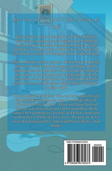 Jamie Gaines needs a boyfriend - and fast. With her family trip coming up, she's forgotten she told them about the elusive Daxton she started dating. The only problem is he doesn't exist. With no time to waste, she goes online in search of the perfect man to play the part. Elliot Whittaker needs a change. He doesn't want the 9-5 anymore, he just wants the stage...and Jamie. With a lingering kiss that has never left his mind, he jumps at the chance to be Daxton. Maybe pretending to be her boyfriend would break down her walls and lead to the real thing. Even his full name - Elliot Daxton Whittaker - is a sign, right? The two head to Park City, Utah, and they quickly learn that faded kiss so long ago wasn't a mistake after all. With no rules on the table - Elliot and Jamie find out they are way more than just a three week fling. With Jamie's first painting in a festival and Elliot's band now on their way to Park City for a show - the pair are in for more than bargained for...but would that really be a bad thing?