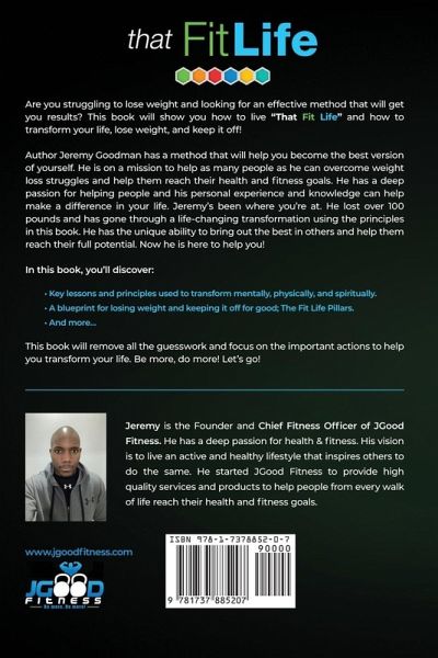 Are you struggling to lose weight and looking for an effective method that will get you results? This book will show you how to live That Fit Life and how to transform your life, lose weight, and keep it off! Author Jeremy Goodman has a method that will help you become the best version of yourself. He is on a mission to help as many people as he can overcome weight loss struggles and help them reach their health and fitness goals. He has a deep passion for helping people and his personal experience and knowledge can help make a difference in your life. Jeremy's been where you're at. He lost over 100 pounds and has gone through a life-changing transformation using the principles in this book. He has the unique ability to bring out the best in others and help them reach their full potential. Now he is here to help you! In this book, you'll discover: - Key lessons and principles used to transform mentally, physically, and spiritually. - A blueprint for losing weight and keeping it off for good; The Fit Life Pillars. - And more... This book will remove all the guesswork and focus on the important actions to help you transform your life. Be more, do more! Let's go!