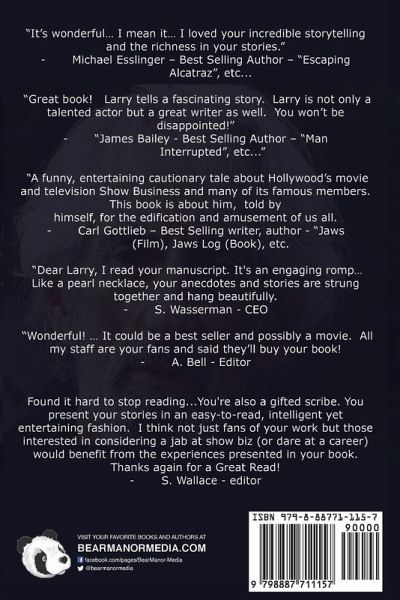 After a confrontational Graduation Day, I decided to run away with a Show Business Circus. Went to Greenwich Village and started bussing bars between 2am and 6am while doing Open Mic Nites at the coffee-houses all over The Village. Within a couple of months, I was opening for Woody Allen, Miles Davis, The Kingston Trio, on to "Second City" in Chicago, became a Founding Member of "The Committee" - A San Francisco attraction rivaling Second City, co-starred or was featured in Escape from Alcatraz, Friends, Seinfeld, Trains, Planes and Automobiles, Home Alone, Billy Madison, Breaking Bad, El Camino, Barry, etc. Within my first year an angry roommate was holding a knife to my throat. It turned out to be more of a "Carny" Show involving money, lots of rejections, The Police, and rent: A cautionary tale. I've had an amazing, sometimes life-threatening, and rewarding life, and I wouldn't trade it for a normal life even if one really existed. "It's wonderful... I mean it... I loved your incredible storytelling and the richness in your stories." - Michael Esslinger, best-selling author of Escaping Alcatraz "Great book! Larry tells a fascinating story. Larry is not only a talented actor but a great writer as well. You won't be disappointed!" - James Bailey, best-selling author of Man Interrupted 3. "A funny, entertaining cautionary tale about Hollywood's movie and television Show Business and many of its famous members. This book is about him, told by himself, for the edification and amusement of us all. - Carl Gottlieb best-selling author of Jaws (film) and The Jaws Log (Book) "Dear Larry, I read your manuscript. It's an engaging romp... Like a pearl necklace, your anecdotes and stories are strung together and hang beautifully." - S. Wasserman, CEO "Wonderful! ... It could be a best seller and possibly a movie. All my staff are your fans and said they'll buy your book!" - A. Bell, editor "Found it hard to stop reading...You're also a gifted scribe. You present your stories in an easy-to-read, intelligent yet entertaining fashion. I think not just fans of your work but those interested in considering a jab at show biz (or dare at a career) would benefit from the experiences presented in your book. Thanks again for a Great Read!" - Stone Wallace, editor