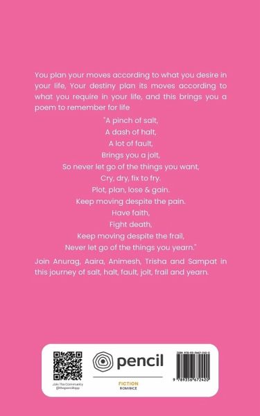 You plan your moves according to what you desire in your life, Your destiny plan its moves according to what you require in your life, And this brings you a poem to remember for life ""A pinch of salt, A dash of halt, A lot of fault, Brings you a jolt, So never let go of the things you want, Cry, dry, fix to fry. Plot, plan, lose & gain. Keep moving despite the pain. Have faith, Fight death, Keep moving despite the frail, Never let go of the things you yearn."" Join Anurag, Aaira, Animesh, Trisha and Sampat in this journey of salt, halt, fault, jolt, frail and yearn.
