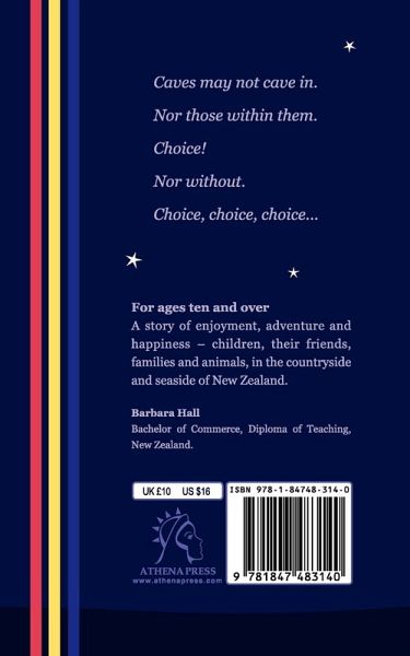 Caves may not cave in Nor those within them. Choice! Nor without. Choice, choice, choice... For ages ten and over A story of enjoyment, adventure and happiness - children, their friends, families and animals, in the countryside and seaside of New Zealand. Barbara Hall. Bachelor of Commerce, Diploma of Teaching, New Zealand.
