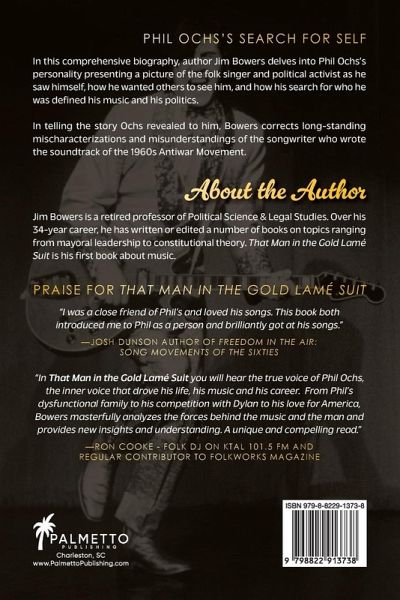 That Man in the Gold Lamé Suit offers a fresh, original, and dynamic examination of Phil Ochs, the often overlooked topical folk singer of the 1960s who wrote the soundtrack to that era's antiwar movement and so much more. That Man in the Gold Lamé Suit explores who Phil Ochs was as he saw and understood himself to be; how he wanted to see himself; and how he wanted to be seen by others. In presenting this exploration of Phil Ochs, author Jim Bowers delves deep into Ochs's personality to craft a narrative that allows the singer/songwriter to tell his own story rather than the story others would impose upon him. In letting Ochs tell his own story, Bowers in That Man in the Gold Lamé Suit provides the reader with insights into how Phil Ochs's search for self came to define who Ochs really was and how it, in turn, shaped his music, his politics, and his relationships with such contemporaries as Bob Dylan.