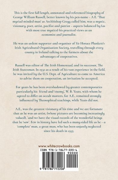 This is the first full length, annotated and referenced biography of George William Russell, better known by his pen-name - A E. 'That myriad minded man' as Archbishop Gregg called him, was a mystic, visionary, poet, artist, pacifist and patriot - aspects balanced by (as with most true mystics) his practical views as an economist and journalist. He was an ardent supporter and organiser of Sir Horace Plunkett's Irish Agricultural Organisation Society, travelling through every county in Ireland talking to the farmers about the advantages of cooperatives. Russell was editor of The Irish Homestead, and its successor, The Irish Statesman. In 1932 as a result of his vast experience in the field, he was invited by the U.S. Dept. of Agriculture to come to America to advise them on cooperation, an invitation he accepted. For years he has been overshadowed by greater contemporaries particularly his friend and 'enemy', W. B. Yeats, with whom he agreed to differ on occult matters, for A.E., remained strongly influenced by Theosophical teachings, while Yeats did not. A.E., was the greatest visionary of his time and we are fortunate that as he was an artist, (whose pictures are becoming increasingly valued), `and we have the visual records of the wonderful beings that he 'saw'. Few in history have led such a many-sided life as he - a 'complete' man, a great man, who has been unjustly neglected since his death in 1935.