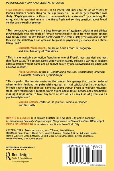 Introduction, Ronnie C. Lesser Part I The Psychogenesis of a Case of Homosexuality in a Woman Chapter 1 The Psychogenesis of a Case of Homosexuality in a Woman ( )., Sigmund Freud Part II Contributions from Academic Scholars Chapter 2 Letter to an Unknown Woman, Teresa de Lauretis Chapter 3 Fallen Women, Diana Fuss Chapter 4 Who was that Girl?, John H. Gagnon Chapter 5 Lying Dreams, Brenda Wineapple Chapter 6 The Failure of Liberalism, David Woolwine Part III Contributions from Psychoanalysts Chapter 7 Designing the Lesbian Subject, Ann D'Ercole Chapter 8 Las Mujeres, RoseMarie Pérez Foster Chapter 9 Conduct Unbecoming, Carolyn C. Grey Chapter 10 Gender as Contradiction, Adrienne Harris Chapter 11 Freud, The Revival, Linda I. Meyers Chapter 12 The Female Homosexual, Donald Moss, Lynne Zeavin Chapter 13 Writing Sex, Erasing Race, Erica Schoenberg Part IV Discussion Chapter 14 Unfinished Business, Muriel Dimen