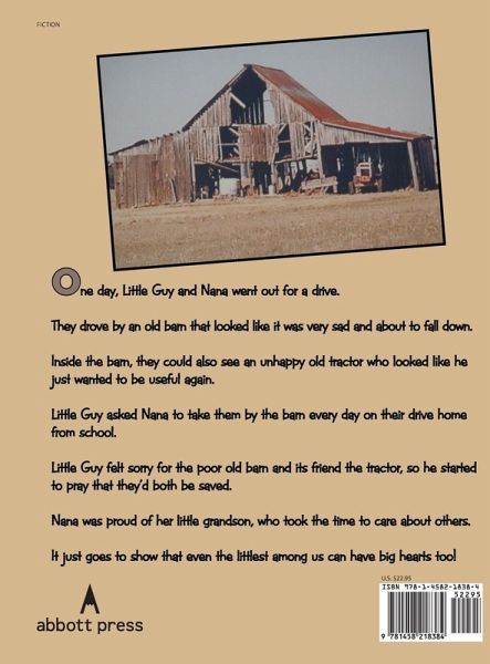 One day, Little Guy and Nana went out for a drive. They drove by an old barn that looked like it was very sad and about to fall down. Inside the barn, they could also see an unhappy old tractor who looked like he just wanted to be useful again. Little Guy asked Nana to take them by the barn every day on their drive home from school. Little Guy felt sorry for the poor old barn and its friend the tractor, so he started to pray that they'd both be saved. Nana was proud of her little grandson, who took the time to care about others. It just goes to show that even the littlest among us can have big hearts too!