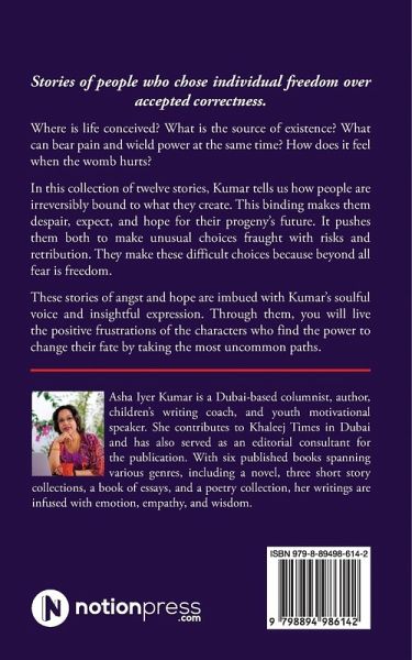 Stories of people who chose individual freedom over accepted correctness. Where is life conceived? What is the source of existence? What can bear pain and wield power at the same time? How does it feel when the womb hurts? In this collection of twelve stories, Kumar tells us how people are irreversibly bound to what they create. This binding makes them despair, expect, and hope for their progeny's future. It pushes them both to make unusual choices fraught with risks and retribution. They make these difficult choices because beyond all fear is freedom. These stories of angst and hope are imbued with Kumar's soulful voice and insightful expression. Through them, you will live the positive frustrations of the characters who find the power to change their fate by taking the most uncommon paths.