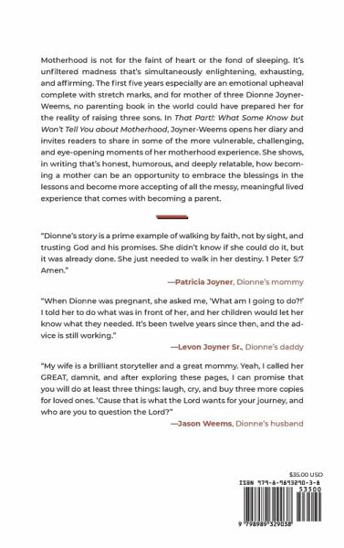 Motherhood is not for the faint of heart or the fond of sleeping. It's unfiltered madness that's simultaneously enlightening, exhausting, and affirming. The first five years especially are an emotional upheaval complete with stretch marks, and for mother of three Dionne Joyner-Weems, no parenting book in the world could have prepared her for the reality of raising three sons. In That Part!: What Some Know but Won't Tell You about Motherhood, Joyner-Weems opens her diary and invites readers to share in some of the more vulnerable, challenging, and eye-opening moments of her motherhood experience. She shows, in writing that's honest, humorous, and deeply relatable, how becoming a mother can be an opportunity to embrace the blessings in the lessons and become more accepting of all the messy, meaningful lived experience that comes with becoming a parent. "Dionne's story is a prime example of walking by faith, not by sight, and trusting God and his promises. She didn't know if she could do it, but it was already done. She just needed to walk in her destiny. 1 Peter 5:7 Amen."-Patricia Joyner, Dionne's mommy "When Dionne was pregnant, she asked me, 'What am I going to do?!' I told her to do what was in front of her, and her children would let her know what they needed. It's been twelve years since then, and the advice is still working."-Levon Joyner Sr., Dionne's daddy "My wife is a brilliant storyteller and a great mommy. Yeah, I called her GREAT, damnit, and after exploring these pages, I can promise that you will do at least three things: laugh, cry, and buy three more copies for loved ones. 'Cause that is what the Lord wants for your journey, and who are you to question the Lord?"-Jason Weems, Dionne's husband