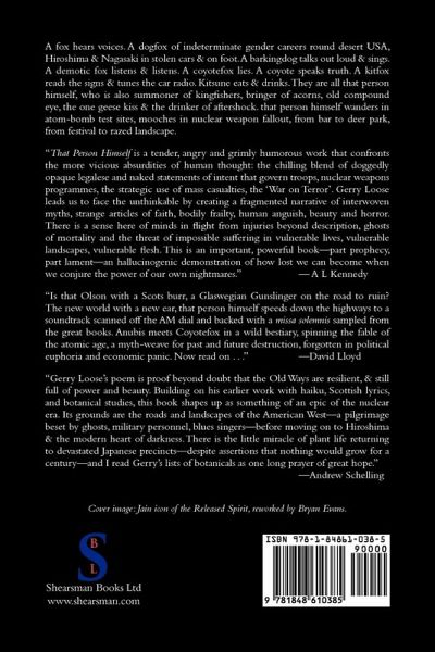 A fox hears voices. A dogfox of indeterminate gender careers round desert USA, Hiroshima & Nagasaki in stolen cars & on foot. A barkingdog talks out loud & sings. A demotic fox listens & listens. A coyotefox lies. A coyote speaks truth. A kitfox reads the signs & tunes the car radio. Kitsune eats & drinks. They are all that person himself, who is also summoner of kingfishers, bringer of acorns, old compound eye, the one geese kiss & the drinker of aftershock. that person himself wanders in atom-bomb test sites, mooches in nuclear weapon fallout, from bar to deer park, from festival to razed landscape.