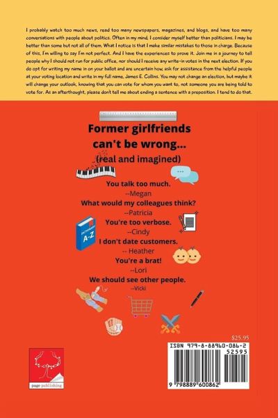 I probably watch too much news, read too many newspapers, magazines, and blogs, and have too many conversations with people about politics. Often in my mind, I consider myself better than politicians. I may be better than some but not all of them. What I notice is that I make similar mistakes to those in charge. Because of this, I'm willing to say I'm not perfect. And I have the experiences to prove it. Join me in a journey to tell people why I should not run for public office, nor should I receive any write-in votes in the next election. If you do opt for writing my name in on your ballot and are uncertain how, ask for assistance from the helpful people at your voting location and write in my full name, James E. Collins. You may not change an election, but maybe it will change your outlook, knowing that you can vote for whom you want to, not someone you are being told to vote for. As an afterthought, please don't tell me about ending a sentence with a preposition. I tend to do that.