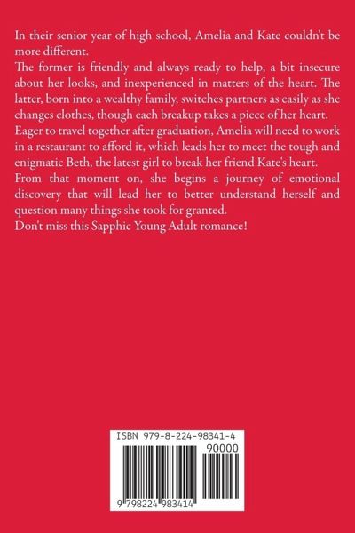 In their senior year of high school, Amelia and Kate couldn't be more different. The former is friendly and always ready to help, a bit insecure about her looks, and inexperienced in matters of the heart. The latter, born into a wealthy family, switches partners as easily as she changes clothes, though each breakup takes a piece of her heart. Eager to travel together after graduation, Amelia will need to work in a restaurant to afford it, which leads her to meet the tough and enigmatic Beth, the latest girl to break her friend Kate's heart. From that moment on, she begins a journey of emotional discovery that will lead her to better understand herself and question many things she took for granted. Don't miss this Sapphic Young Adult romance!