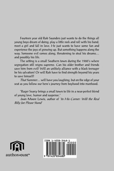 Fourteen year old Rob Saunders just wants to do the things all young boys dream of doing; play a little rock and roll with his band, meet a girl and fall in love. He just wants to have some fun and experience the joys of growing up. But something happens along the way. Someone evil comes along, threatening to steal his dreams.and possibly his life. The setting is a small Southern town during the 1960's where segregation still reigns supreme. Can his older brother and friends save him from evil? Will an unlikely alliance with a black teenager be his salvation? Or will Rob have to find strength beyond his years to save himself? That Summer. will have you laughing, but on the edge of your seat as you follow our hero's journey from boyhood into manhood. "Roger Searcy brings a small town to life in a near-perfect blend of young love, humor and suspense." -Joan Moore Lewis, author of 'In His Corner: Will the Real Billy Joe Please Stand'