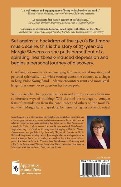 Set against a backdrop of the 1970's Baltimore music scene, this is the story of 23-year-old Margie Stevens as she pulls herself out of a spiraling, heartbreak-induced depression and begins a personal journey of discovery. Clarifying her own views on emerging feminism, social injustice, and personal spirituality-all while touring across the country as a singer in King Vido's Swing Band-Margie encounters sexist and moral challenges that cause her to question her future path. Will she redefine her personal values in order to break away from uncomfortable ways of thinking? Will she find the courage to conquer fears of intimidation from the band leader and others on the tour? Finally, will Margie learn to speak up for herself using her authentic voice?