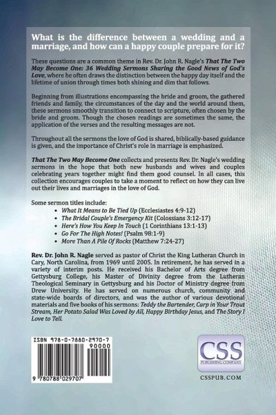 What is the difference between a wedding and a marriage, and how can a happy couple prepare for it? These questions are a common theme in Rev. Dr. John R. Nagle’s That The Two May Become One: The Good News Of God’s Love Shared With The Happy Couple, where he often draws the distinction between the happy day itself and the lifetime of union through times both shining and dim that follows. Beginning from illustrations encompassing the bride and groom, the gathered friends and family, the circumstances of the day and the world around them, these sermons smoothly transition to connect to scripture, often chosen by the bride and groom in question. Though the chosen readings are sometimes the same, the application of the verses and the resulting messages are not. Throughout all the sermons the love of God is shared, biblically-based guidance is given, and the importance of Christ’s role in marriage is emphasized. That The Two May Become One collects and presents Rev. Dr. Nagle’s wedding sermons in the hope that both new husbands and wives and couples celebrating years together might find them good counsel. In all cases, this collection encourages couples to take a moment to reflect on how they can live out their lives and marriages in the love of God. Some sermon titles include: What It Means to Be Tied Up (Ecclesiastes 4:9-12) The Bridal Couple’s Emergency Kit (Colossians 3:12-17) Here’s How You Keep In Touch (1 Corinthians 13:1-13) Go For The High Notes! (Psalm 98:1-9) More Than A Pile Of Rocks (Matthew 7:24-27)