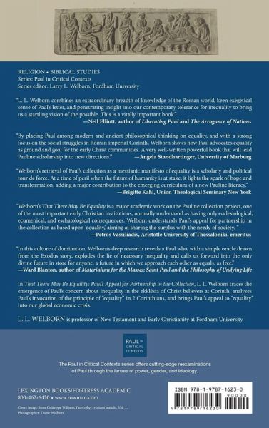 In That There May Be Equality, L. L. Welborn traces the emergence of Paul's concern about inequality in the ekklesia of Christ believers at Corinth, analyzes Paul's invocation of the principle of "equality" in 2 Corinthians, and brings Paul's appeal to "equality" into our global economic crisis.