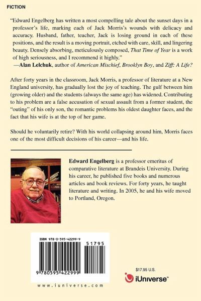 "Edward Engelberg has written a most compelling tale about the sunset days in a professor's life, marking each of Jack Morris's wounds with delicacy and accuracy. Husband, father, teacher, Jack is losing ground in each of these positions, and the result is a moving portrait, etched with care, skill, and lingering beauty. Densely absorbing, meticulously composed, That Time of Year is a work of high seriousness, and I recommend it highly."-Alan Lelchuk, author of American Mischief, Brooklyn Boy, and Ziff: A Life? After forty years in the classroom, the joy of teaching has gradually disappeared for Jack Morris, a professor of literature at a New England university. The gulf between him (growing older) and the students (always the same age) has widened. Contributing to his problem are a false accusation of sexual assault from a former student, the "outing" of his only son, the romantic problems his oldest daughter faces, and the fact that his wife is at the top of her game. Should he voluntarily retire? With his world collapsing around him, Morris faces one of the most difficult decisions of his career-and his life.