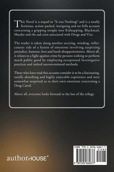 This Novel is a sequel to "It was Nothing!’ and is a totally fictitious, action packed, intriguing and no frills account concerning a gripping insight into Kidnapping, Blackmail, Murder and the sad costs associated with Drugs and Vice. The reader is taken along another exciting, winding, roller-coaster ride of a fusion of emotions involving surprising prejudice, humour, love and harsh disappointments. Above all, it relates to a fight against crime by persons wishing to perform much public good by employing exceptional Investigative practices and indeed unconventional methods. Those who have read this account consider it to be a fascinating, totally absorbing and highly enjoyable experience and were somewhat surprised as to their own emotions concerning a Drug Cartel. Above all, everyone looks forward to the last of the trilogy.