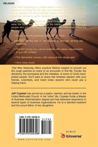 That Was Yesterday is a unique blend of story-telling and practical guidance for living life the way God intended. Author Jeff Copelan brings familiar and not-so-familiar people from the Bible to life and uses their stories to guide readers through real-life decisions today. That Was Yesterday tells the stories of Biblical personalities by taking what the Bible says and filling in the blanks, recreating them into people who might live next door or be in tomorrow's news. Read the stories of: David, second-guessing God's call to action Rahab, as the last of her people, a stranger among the Israelites The rich young man, as he wrestles with Jesus' requirements to join His ministry The Samaritan woman, with Jesus at the village well And many more! That Was Yesterday offers practical Biblical insights to smooth out the rough patches so many of us encounter in this life. Ponder the decisions, the successes and the mistakes, of some of God's hand-picked people. You'll want to share this timeless wisdom with your friends, coworkers, and loved ones-anyone who could use a helping hand.