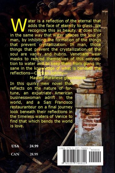 Water is a reflection of the eternal that adds the face of eternity to glass. We recognize this as beauty. It does this in the same way that water shapes the soul of man, by inhibiting the formation of the things that prevent crystallization. In man, those things that prevent the crystallization of the soul are vanity and hubris. Venetians wear masks to remind themselves of this connection to water and to keep them from going insane in the knowledge of what is beneath the reflections -Chicken Johnny- Master Muranese Glassblower In this quirky new novel that reflects on the nature of fortune, an expatriate American businesswoman adrift in the world, and a San Francisco restauranteur on a final journey look beneath their reflections in the timeless waters of Venice to find that which bends the world is love.