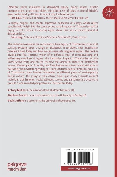 1. Introduction (Antony Mullen, David Jeffery, Stephen Farrall).- Part I. Ideologies.- 2. The Ideological Composition of the Parliamentary Conservative Party from Thatcher to May (Timothy Heppell).- 3. Intellectual Reactions to Thatcherism: Conceptions of Citizenship and Civil Society from 1990-2010 (Edmund Neill).- 4. Data-Driven Government: The Triumph of Thatcherism or the Revenge of Society? (Kieron O'Hara).- Part II. Regions.- 5. 'Rolling Back the Frontiers of the State, Only to See Them Re-imposed in Docklands?': Margaret Thatcher, Michael Heseltine and the Contested Parenthood of Canary Wharf (Jack Brown).- 6. 'The Jezebel Who Sought to Destroy Israel in a Day': Margaret Thatcher's Impact on the Northern Ireland Peace Process, 1984-1990 (Fiona McKelvey).- 7. "The Iron Lady? She Devastated the Country": Former Scottish Steelworkers' Narratives of Unions, Community and Thatcherism (James Ferns).- 8. Thatcherism and Wales: Impacts and Legacies (Sam Blaxland).- Part III. Attitudes.- 9. The Political Socialisation of Thatcher's Children: Identifying the Long Reach of Thatcherite Social and Economic Values and Perceptions of Crime (Emily Gray, Maria Grasso, Stephen Farrall).- 10. Margaret Thatcher and the Rhetorical Road to Brexit (Andrew S. Crines).- 11. Thatcher's Legacy and Social Security (Ruth Davidson).- Part IV. Interpretations.- 12. Thatcher's Young Men and the End of the Party: Parody, Predictions and Problems in Literary Representations of Thatcherism (Dominic Dean).- 13. The Politics of The Iron Lady (Antony Mullen).- 14. 'Death of a Member', 10 April 2013 (Martin Farr).