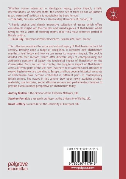 1. Introduction (Antony Mullen, David Jeffery, Stephen Farrall).- Part I. Ideologies.- 2. The Ideological Composition of the Parliamentary Conservative Party from Thatcher to May (Timothy Heppell).- 3. Intellectual Reactions to Thatcherism: Conceptions of Citizenship and Civil Society from 1990-2010 (Edmund Neill).- 4. Data-Driven Government: The Triumph of Thatcherism or the Revenge of Society? (Kieron O'Hara).- Part II. Regions.- 5. 'Rolling Back the Frontiers of the State, Only to See Them Re-imposed in Docklands?': Margaret Thatcher, Michael Heseltine and the Contested Parenthood of Canary Wharf (Jack Brown).- 6. 'The Jezebel Who Sought to Destroy Israel in a Day': Margaret Thatcher's Impact on the Northern Ireland Peace Process, 1984-1990 (Fiona McKelvey).- 7. "The Iron Lady? She Devastated the Country": Former Scottish Steelworkers' Narratives of Unions, Community and Thatcherism (James Ferns).- 8. Thatcherism and Wales: Impacts and Legacies (Sam Blaxland).- Part III. Attitudes.- 9. The Political Socialisation of Thatcher's Children: Identifying the Long Reach of Thatcherite Social and Economic Values and Perceptions of Crime (Emily Gray, Maria Grasso, Stephen Farrall).- 10. Margaret Thatcher and the Rhetorical Road to Brexit (Andrew S. Crines).- 11. Thatcher's Legacy and Social Security (Ruth Davidson).- Part IV. Interpretations.- 12. Thatcher's Young Men and the End of the Party: Parody, Predictions and Problems in Literary Representations of Thatcherism (Dominic Dean).- 13. The Politics of The Iron Lady (Antony Mullen).- 14. 'Death of a Member', 10 April 2013 (Martin Farr).