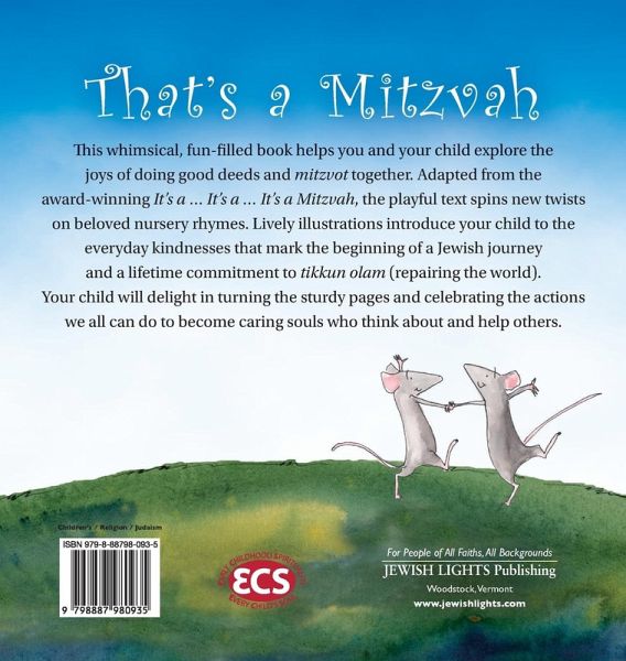 Adapted from the award-winning It's a ... It's a ... It's a Mitzvah, this whimsical book helps children explore the joys of doing good deeds and mitzvot. Lively text and illustrations introduce preschoolers to the everyday kindnesses that mark the beginning of a Jewish journey and a lifetime commitment to tikkun olam (repairing the world).