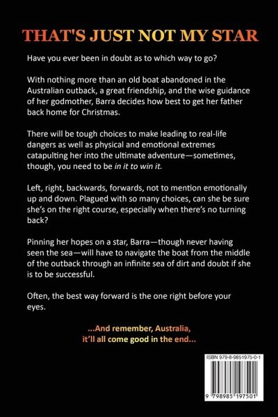 Have you ever been in doubt as to which way to go? With nothing more than an old boat abandoned in the Australian outback, a great friendship, and the wise guidance of her godmother, Barra decides how best to get her father back home for Christmas. There will be tough choices to make leading to real-life dangers as well as physical and emotional extremes catapulting her into the ultimate adventure-sometimes, though, you need to be in it to win it. Left, right, backwards, forwards, not to mention emotionally up and down. Plagued with so many choices, can she be sure she's on the right course, especially when there's no turning back? Pinning her hopes on a star, Barra-though never having seen the sea-will have to navigate the boat from the middle of the outback through an infinite sea of dirt and doubt if she is to be successful. Often, the best way forward is the one right before your eyes.