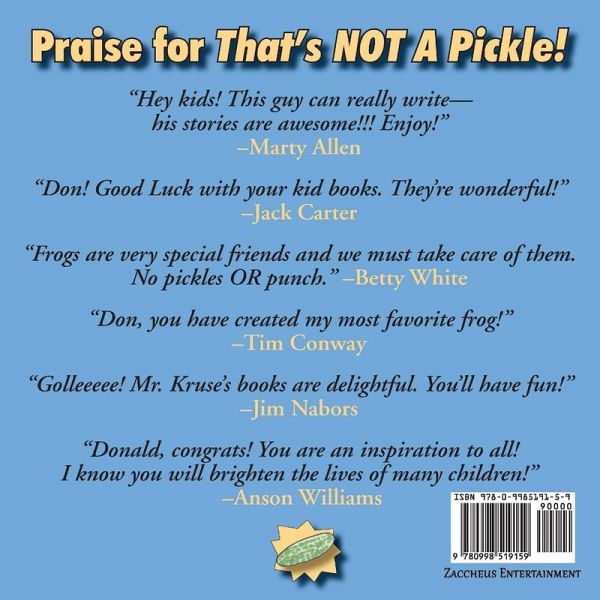 That's NOT A Pickle! is the first book in a series of seven about a boy and his pet frog, both of whom love pickes as much as Popeye loves spinach! In fact, the boy meets the frog in a pickle jar and they become best friends. The boy decides to use the friendship to entertain/scare his disagreeable sister who happens to be frog-phobic. All's fair in pickle jars and frog fairs! This story exemplifies the spontaneous joy of living and teaches young kids the wonderful joy of reading. Written in catchy verse, and illustrated throughout with humorous, colorful illustrations, this story will keep kids ages 3 and up entertained and happy for hours. Phyllis Diller and Jerry Lewis loved it ... and so will YOU!