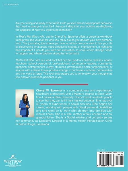 Are you willing and ready to be truthful with yourself about inappropriate behaviors that need to change in your life? Are you finding that your actions are displaying the opposite of how you want to be identified? In That's Not Who I AM, author Cheryl W. Spooner offers a personal workbook to help you see yourself for who you really are as you declare your own personal truth. This journaling tool shows you how to rethink how you want to live your life by discovering what areas need productive change or improvement. It highlights how important it is to do your own self-evaluation, to unveil where change needs to happen and where positive strengths lie dormant. That's Not Who I Am is a work tool that can be used for children, families, adults, teachers, school personnel, professionals, community leaders, community agencies, entrepreneurs, clergy, churches, private/public sector organizations or anyone with a desire to see positive change in our homes, schools, communities and the world at large. This tool encourages you to write down your thoughts as you answer questions personal to you.