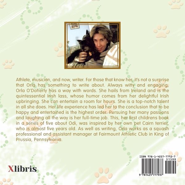 Athlete, musician, and now, writer. For those that know her, it's not a surprise that Orla has something to write about. Always witty and engaging, Orla O'Doherty has a way with words. She hails from Ireland and is the quintessential Irish lass, whose humor comes from her delightful Irish upbringing. She can entertain a room for hours. She is a top-notch talent in all she does. Her life experience has led her to the conclusion that to be happy and entertained is the highest order. Pursuing her many passions and laughing all the way is her full-time job. This, her first childrens book in a series of five about Odi, was inspired by her own pet Cairn terrier, who is almost five years old. As well as writing, Orla works as a squash professional and assistant manager at Fairmount Athletic Club in King of Prussia, Pennsylvania.