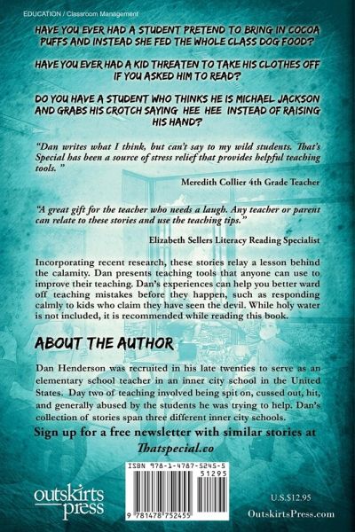 Have you ever had a student pretend to bring in Cocoa Puffs and instead she fed the whole class dog food? Have you ever had a kid threaten to take his clothes off if you asked him to read? Do you have a student who thinks he is Michael Jackson and grabs his crotch saying "hee, hee" instead of raising his hand? Follow these real life stories of an inner city teacher's struggle to instruct unruly kids and find simple solutions a teacher or parent can use to manage children. When you have children of your own, you realize the struggle of preoccupying one child. Add 20 or more children into the mix and you have teaching. How are you going to keep every child occupied and group different learners? How are you going to manage the kid who jumps out of windows? Instead of writing a textbook, Dan Henderson decided to write a compilation of teachable moments. That's Special is arranged with each chapter starting with how the situation went awry. The tension builds, and the student pushes the teacher to the inevitable standoff. Are you going to issue a consequence, or will you chicken out? The book relays the importance of standing up to threats during child rearing. Incorporating recent research, these stories relay a lesson behind the calamity. Dan presents teaching tools that anyone can use to improve their teaching. Dan's experiences can help you better ward off teaching mistakes before they happen, such as responding calmly to kids who claim they have seen the devil. While holy water is not included, it is recommended while reading this book. When Dan saw his students doing something strange, he would think "That's Special," as a cue to not take his job too seriously. It is his inspirational mantra for his mental health. He used it to remind himself to get back in the saddle, laugh it off, and develop one of life's greatest skills, perseverance. From the Author: Layered in all the ridiculous stories are real experiences you might encounter, which I