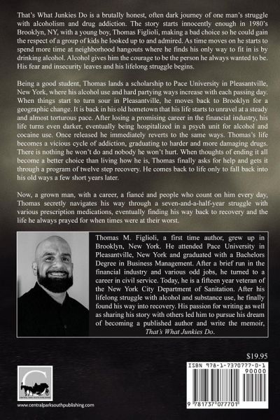 That's What Junkies Do is a brutally honest, often dark journey of one man's struggle with alcoholism and drug addiction. The story starts innocently enough in 1980's Brooklyn, NY, with a young boy, Thomas Figlioli, making a bad choice so he could gain the respect of a group of kids he looked up to and admired. Alcohol gives him the courage to be the person he always wanted to be. His fear and insecurity leaves and his lifelong struggle begins. Being a good student, Thomas lands a scholarship to Pace University in Pleasantville, New York, where his alcohol use and hard partying ways increase with each passing day. When things start to turn sour in Pleasantville, he moves back to Brooklyn for a geographic change. It is back in his old hometown that his life starts to unravel at a steady and almost torturous pace. After losing a promising career in the financial industry, his life turns even darker, eventually being hospitalized in a psych unit for alcohol and cocaine use. Once released he immediately reverts to the same ways. Thomas's life becomes a vicious cycle of addiction, graduating to harder and more damaging drugs. There is nothing he won't do and nobody he won't hurt. When thoughts of ending it all become a better choice than living how he is, Thomas finally asks for help and gets it through a program of twelve step recovery. He comes back to life only to fall back into his old ways a few short years later. Now, a grown man and upstanding citizen, with a career, a fiancé and people who count on him every day, Thomas secretly navigates his way through a seven-and-a-half-year struggle with various prescription medications, eventually finding his way back to recovery and the life he always prayed for when times were at their worst.