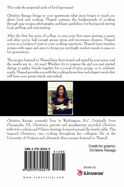 This ends the perpetual cycle of food ignorance! Christine Ravago brings to your apartments what mom forgot to teach you about food and cooking. Thawed contains the fundamentals of cooking through easy recipes, photographs, and basic guidelines for buying and storing food, grilling, and entertaining. After the first few years of college or even your first years starting a career and after you've had enough greasy pizza and microwave dinners, Thawed serves as a fool-proof start to your cooking repertoire. Thawed fuses timeless recipes with sugar and spice to bring you excitingly modern meals to pass on for generations. The recipes featured in Thawed have been tested and tasted by your peers, and the results are in...it's easy! Whether it's to impress the girl you just started dating, to gather friends together for a round of juicy gossip, or to celebrate youth, Thawed provides you with the cooking know-how and elegant meals that will leave your guests utterly astonished.