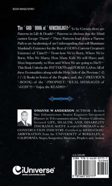The `-GOD `-BOOK of `-NUMEROLOGY!~' To be Certain there are Patterns in Life & Death!~' Patterns so obvious that the Mind cannot Escape Them!~' These Patterns lead down a Narrow Path to an Awakening of an Understanding that will Illuminate Mankind's Existence for the Rest of GOD's Current Creation's Existence of Time!!!~' From how We're Born, Where We're Born, Who We Marry, How Many Kids We will Have; and, Most Importantly; to How and When We are going to Die!!!~' This Book Unlocks the PATTERNS and FORMULAS to All of these Eventualities along with the Help Aids of the Previous (`-2) / (`-3) Books in Series of the Prophet; and, the (`-PREVIOUS `-BOOK) of the `-PROPHET: "REAL MESSAGES of `-GOD"!!!~' Enjoy the READS!!!~'