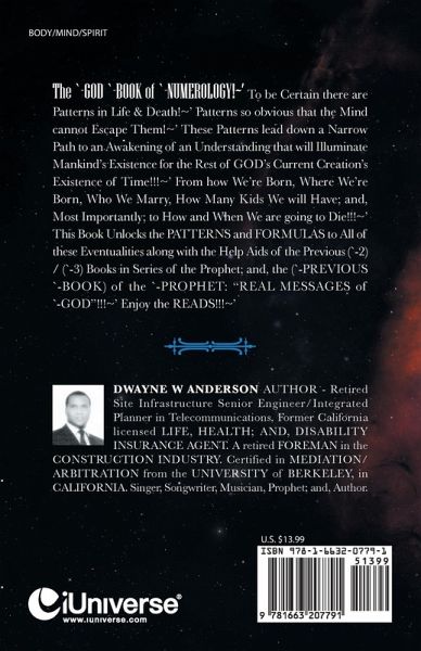 The `-GOD `-BOOK of `-NUMEROLOGY!~' To be Certain there are Patterns in Life & Death!~' Patterns so obvious that the Mind cannot Escape Them!~' These Patterns lead down a Narrow Path to an Awakening of an Understanding that will Illuminate Mankind's Existence for the Rest of GOD's Current Creation's Existence of Time!!!~' From how We're Born, Where We're Born, Who We Marry, How Many Kids We will Have; and, Most Importantly; to How and When We are going to Die!!!~' This Book Unlocks the PATTERNS and FORMULAS to All of these Eventualities along with the Help Aids of the Previous (`-2) / (`-3) Books in Series of the Prophet; and, the (`-PREVIOUS `-BOOK) of the `-PROPHET: "REAL MESSAGES of `-GOD"!!!~' Enjoy the READS!!!~'