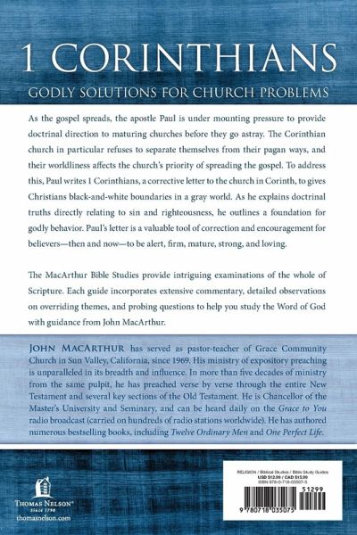 As the gospel spreads to the far corners of the earth, the apostle Paul is under mounting pressure to provide direction to maturing churches before they go astray. It's with this urgency that Paul covers many topics that are especially relevant in today's society. Pastor John MacArthur will take you through the first letter to the church in Corinth to show how this church in particular allowed their worldliness to affect the church's priority of spreading the gospel--and how Paul's response gives Christians black-and-white boundaries in a gray world. As Paul explains doctrinal truths directly relating to sin and righteousness, he outlines a foundation for godly behavior. Paul's letter is a valuable tool of correction and encouragement for believers--then and now--to be alert, firm, mature, strong, and loving. --ABOUT THE SERIES-- The MacArthur Bible Study series is designed to help you study the Word of God with guidance from widely respected pastor and author John MacArthur. Each guide provides intriguing examinations of the whole of Scripture by examining its parts and incorporates: Extensive, but straight-forward commentary on the text. Detailed observations on overriding themes, timelines, history, and context. Word and phrase studies to help you unlock the broader meaning and apply it to your life. Probing, interactive questions with plenty of space to write down your response and thoughts.